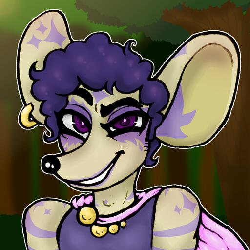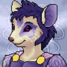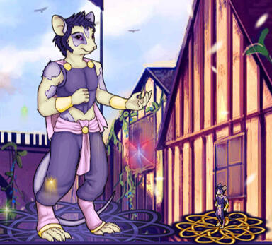 IN-GAME DESCRIPTION: Before you is a short statured, thin yet curvy male Rodent covered in sandy fur that has been dyed in places with violet markings. His curious amethyst gaze is pensive, cunning, and perhaps a little cheeky. Decorated with golden filigrees that match his right ear piercing, his clothing appears expensive, but it also has a durable quality to it. The subtle aroma he emits resembles honey. His voice is mid-toned, but after hearing him speak enough, one would notice the range in pitch he exhibits depending on his mood. Often on his shoulder or at his feet is his friendly Minidrake runt, Finder - and never far away is his protective opaline Dracosaur, Keeper. Some may recognize this dragon-riding mouse as a well-known treasure hunter for hire and (semi) reformed thief.